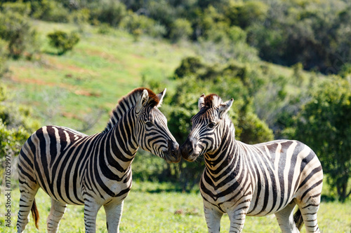 © charissalotter, Fototapeta premium Zebras standing and sniffing each other