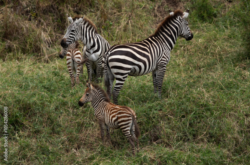 Naklejka premium Zebras with foal at Savannah grassland, Masai Mara