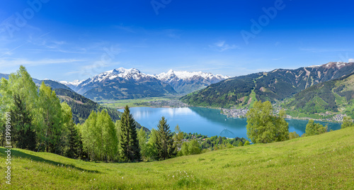 Fototapeta premium Zell am See at spring, snowy mountain tops, Salzburg, Austria