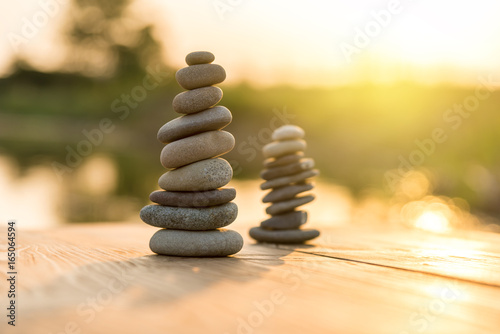 © Grigor, Obraz premium Zen Balancing Pebbles Next to a Misty Lake