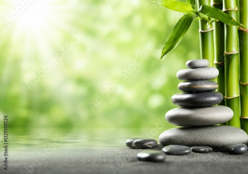 Obraz premium Zen garden with stacked stones and bamboo in serene natural setting