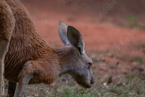 Fototapeta premium Zen Kangaroo: Serene Profile Portrait with Red Earth Bokeh