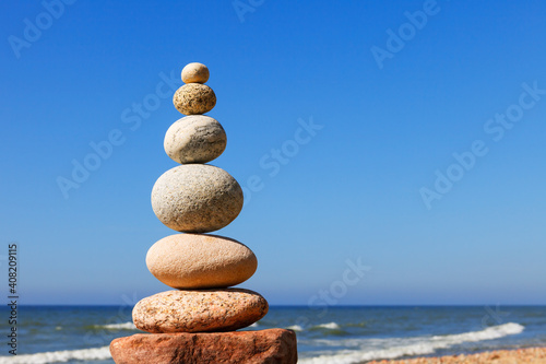 Fototapeta premium Zen pyramid of balanced stones on a background of the summer sea and blue sky