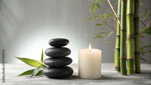 Obraz premium Zen Still Life: Stone, Candle, and Bamboo