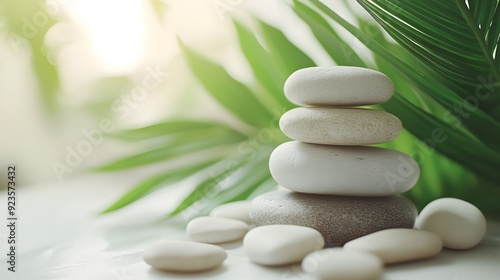 Obraz premium Zen stone stack, bright natural lighting, palm leaf, soft green background, minimalist spa composition, smooth pebbles balanced, tranquil atmosphere, copy space for text.