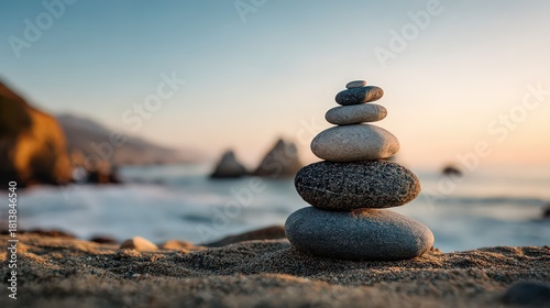 © WawaCreative, Fototapeta premium Zen Stone Stack on Beach at Sunset with Golden Light Reflection and Soft Focus Rock Formation in Background