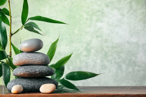 © 为轩 张, Fototapeta premium Zen stone stack with bamboo leaves on wooden table, serene spa concept banner with green background and ample copy space, capturing tranquility in boho style with smooth natural light.