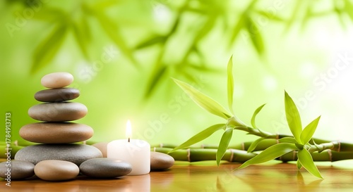 © Mostafizur, Obraz premium Zen stones stacked beside a lit candle with bamboo and green leaves in the background background