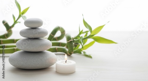 © Khoirul, Fototapeta premium Zen stones stacked with candle and bamboo leaves for relaxation and meditation.