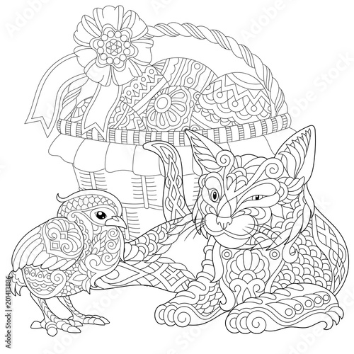 © Sybirko, Fototapeta premium Zentangle cat and baby chicken with Easter basket full of eggs