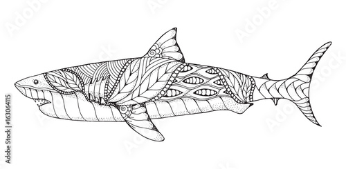 Naklejka premium Zentangle i prążkowany stylizowany żarłacz biały. Wektor, ilustracja, wzór. Sztuka Zen. Czarno-biały ilustracja na białym tle. Kolorowanka antystresowa dla dorosłych.