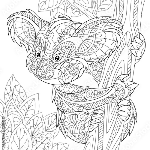 © Sybirko, Fototapeta premium Zentangle stylized cartoon koala bear sitting among tree leaves. Hand drawn sketch for adult antistress coloring page, T-shirt emblem, logo or tattoo with doodle, zentangle, floral design elements.