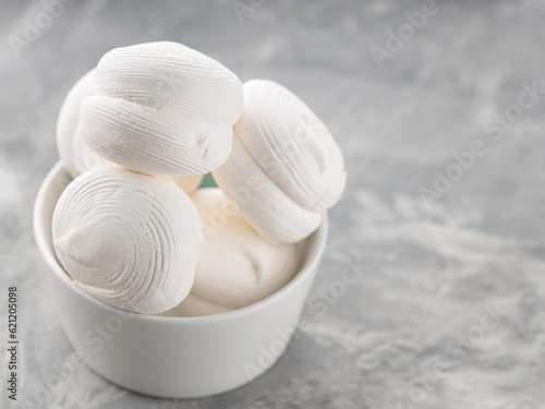 © Lazartivan, Fototapeta premium Zephyr marshmallows in bowl on a gray background. Sweet dessert marshmallows on concrete. Copy space