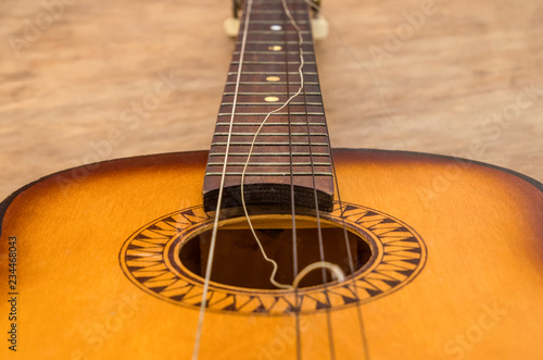 Naklejka premium Zepsute struny do gitary, naprawa gitary