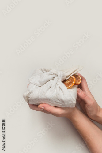 Obraz premium Zero waste, Christmas eco-friendly gift wrapping in traditional Japanese...