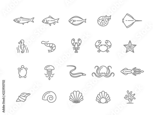 © Lifeking, Obraz premium Zestaw ikon linii ryb i owoców morza. Krewetki, ostrygi, kalmary, kraby, łokcie, fugu, homary, karpie, jesiotry, meduzy, ośmiornice, żółwie, rozgwiazdy, koralowce, sprzedaż, koniki morskie i inne. Edytowalny skok.