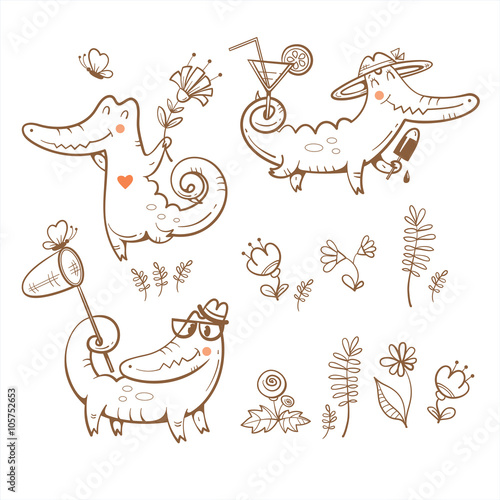 © voron4ihina, Naklejka premium Zestaw kreskówka krokodyle. Czas letni. Motyle i kwiaty. Lody i koktajle. Grafika wektorowa. Rysunek konturowy.