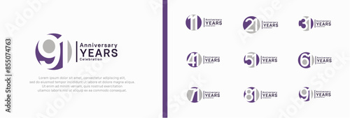 Naklejka premium zestaw logotypów rocznicowych. Wektorowy projekt w kolorze fioletowym i szarym może być używany do świętowania