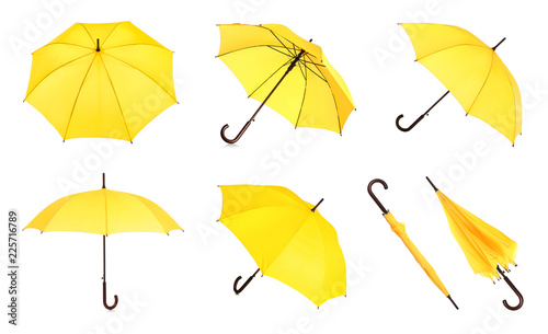 © New Africa, Obraz premium Zestaw z eleganckim żółtym parasolem z różnych widoków na białym tle