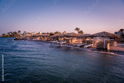 Obraz premium Zeytouna Insel in El Gouna, Ägypten, in der Abenddämmerung mit Liegestühlen und Sonnenschirmen
