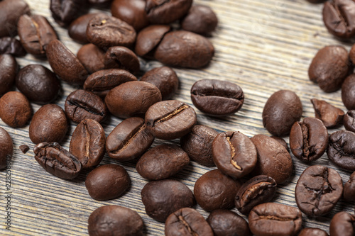 © NewFabrika, Naklejka premium Ziarna kawy na tle drewna