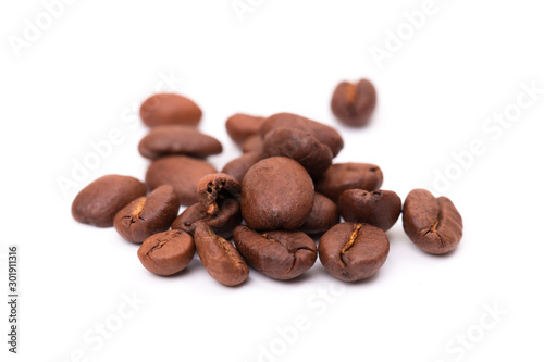 © Nana_studio, Naklejka premium Ziarna kawy samodzielnie na białym tle dla przestrzeni kopii.