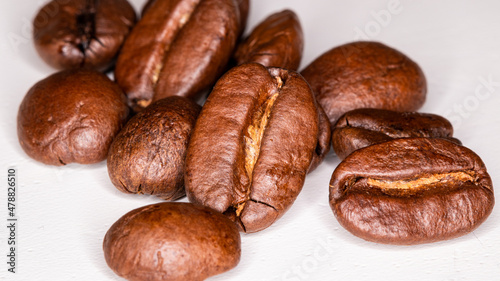 © Marcin C, Obraz premium ziarna palonej kawy w makro powiekszeniu.