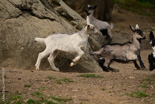 © Grubärin, Fototapeta premium Ziegenparadies. Verschiedene Ziegen klettern fröhlich an einem Felsen