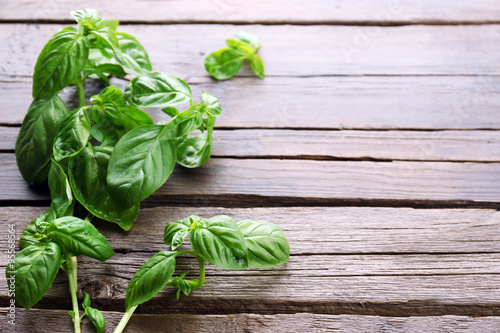 Fototapeta premium Zielona świeża bazylia na podłoże drewniane