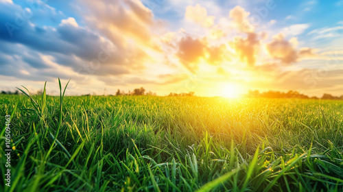© Sawyer0, Fototapeta premium Zielona trawa pokrywa wzgórza, które spływają w dół w kierunku zachodzącego słońca. Z nieba spływają złote i pomarańczowe promienie, które rozświetlają krajobraz.