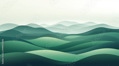 © Sawyer0, Obraz premium Zielony abstrakcyjny krajobraz ukazuje płynne, faliste linie gór i wzgórz, w stonowanej palecie zieleni.