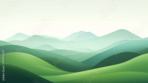 Naklejka premium Zielony abstrakcyjny krajobraz ukazuje płynne, faliste linie gór i wzgórz, w stonowanej palecie zieleni.
