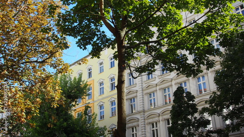 © finecki, Fototapeta premium Zielony Berlin: stare fasady budynków w Mitte, drzewa uliczne