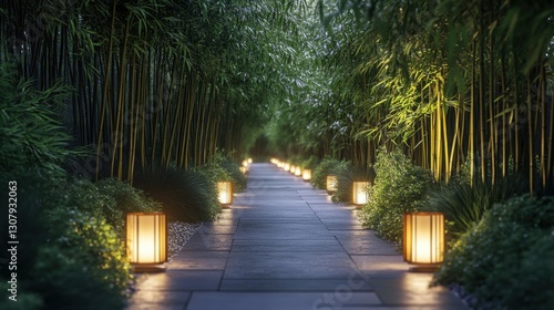 © YauheniB, Fototapeta premium Zielony ogród z lampionami