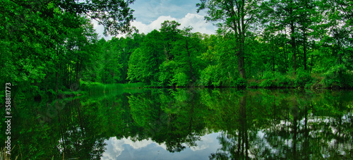 Fototapeta premium ZIELONY POROŚNIĘTY BRZEG JEZIORA