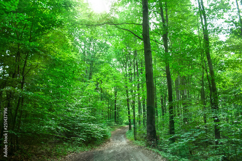 Obraz premium Zielony, wiosenny las w Górach Swiętokrzyskich w promieniach słońca