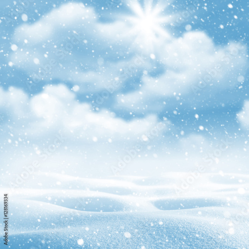 Fototapeta premium Zima w tle. Zimowy krajobraz zaspy i błękitne niebo z chmurami