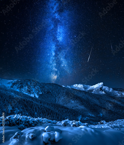 Fototapeta premium Zimne Tatry z Drogą Mleczną i spadającymi gwiazdami, Polska