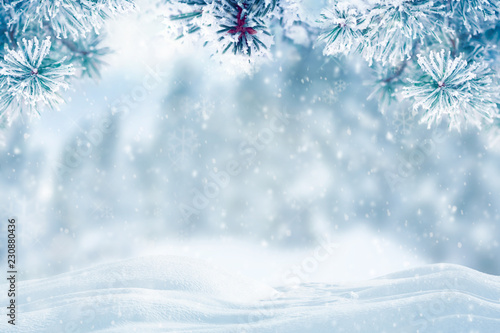 Naklejka premium Zimowe tło, padający śnieg na gałęziach sosny kopiować przestrzeń