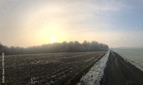 © Pawel, Fototapeta premium zimowe widoki - szron na polu i spacer z psem