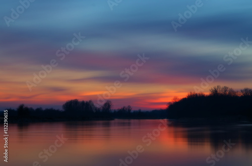 © Rafał Okraj, Fototapeta premium Zimowy zachód słońca / Zimowy, grudniowy zachód słońca w dolinie Pilicy odzwierciedlony w jej wodach.