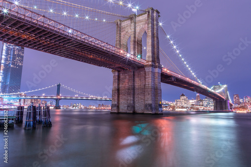 © Andriy Stefanyshyn, Fototapeta premium Zobacz na Brooklyn Bridge i Manhattan Bridge z East River w nocy z długim czasem naświetlania