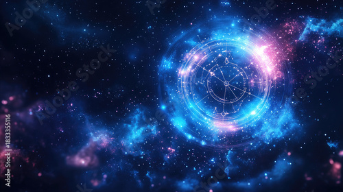 Obraz premium Zodiac wheel spinning on starry night sky, mystical astrology concept with...