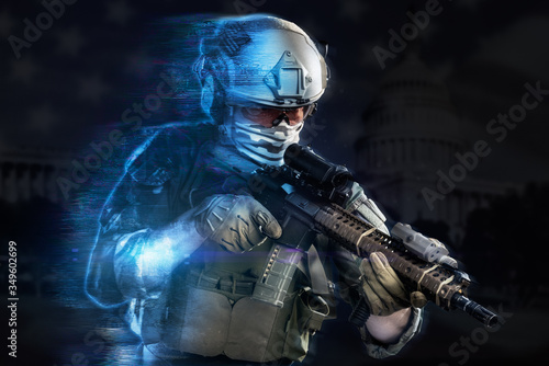Fototapeta premium Żołnierz korpusu piechoty morskiej USA wychodzący z projekcji holograficznej...
