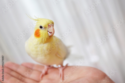 Obraz premium Żółta nimfa na kobiecej dłoni