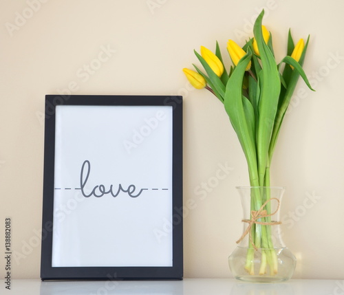 © adix89, Naklejka premium zółte tulipany i ramka z napisem kocham
