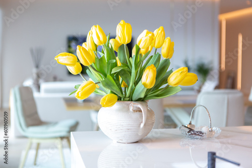 Naklejka premium Żółte tulipany w wazonie w domu