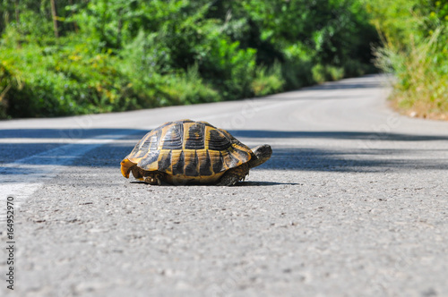 Naklejka premium Żółw Hermanna (Testudo hermanni) na środku drogi. Droga asfaltowa przez żółwia