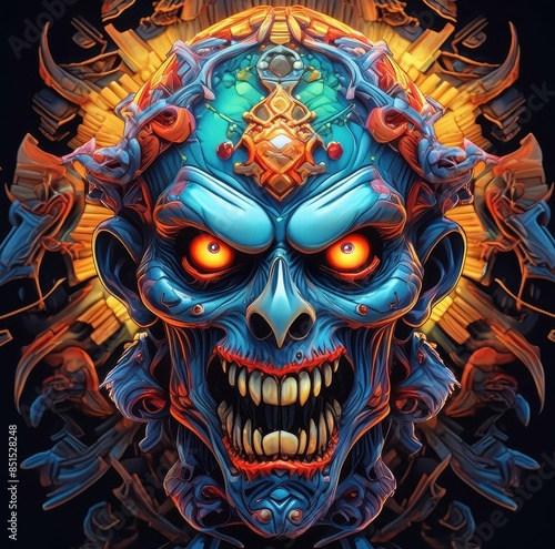 Naklejka premium zombie angry face with feather helmet on his head, face view, symmetrical...