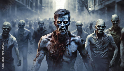 © CreativeMinds, Fototapeta premium Zombie crowd emerging into city background